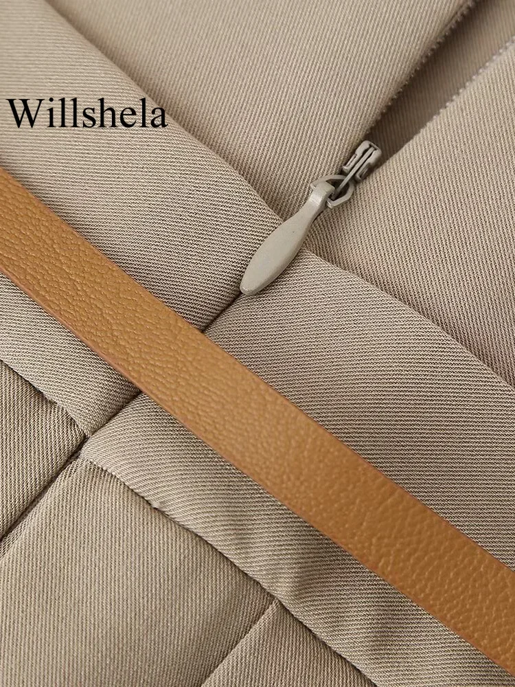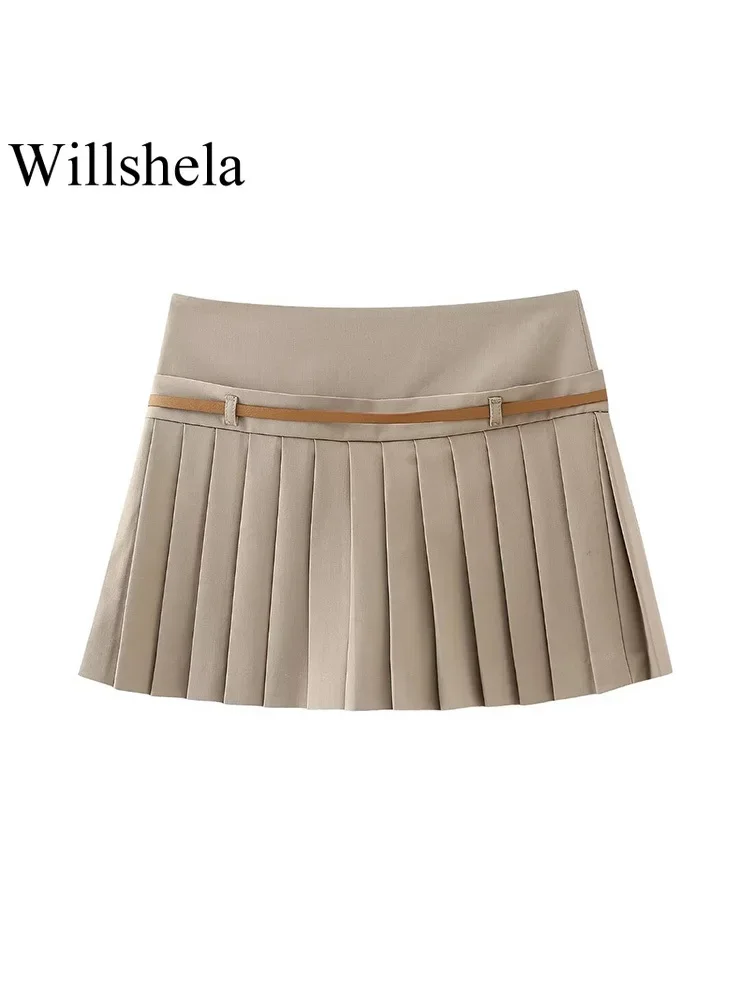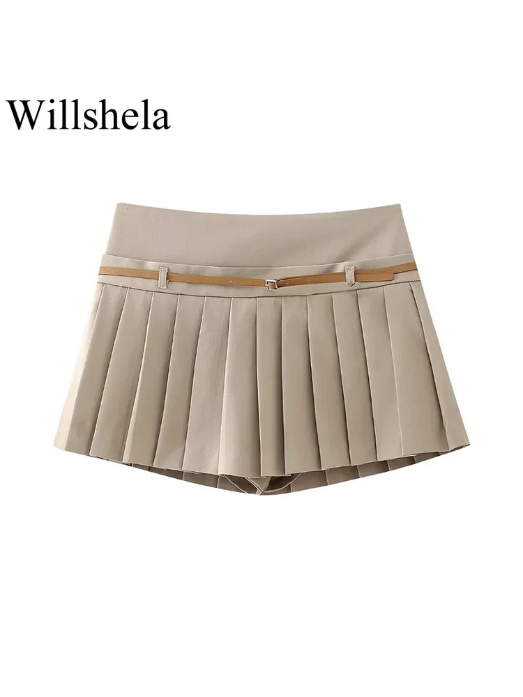 Willshela Women Fashion With Belt Solid Pleated Side Zipper Mini Skirts Shorts Vintage High Waist Female Chic Lady Shorts